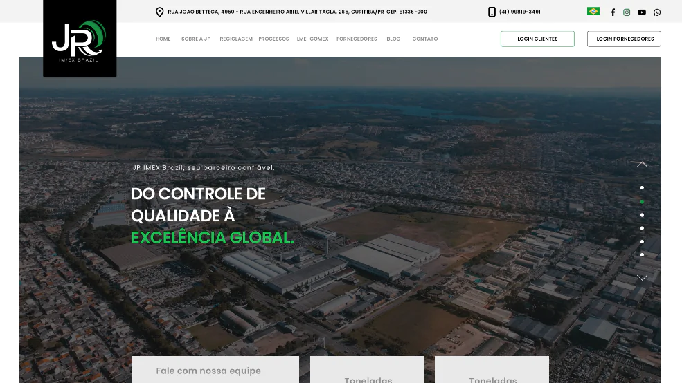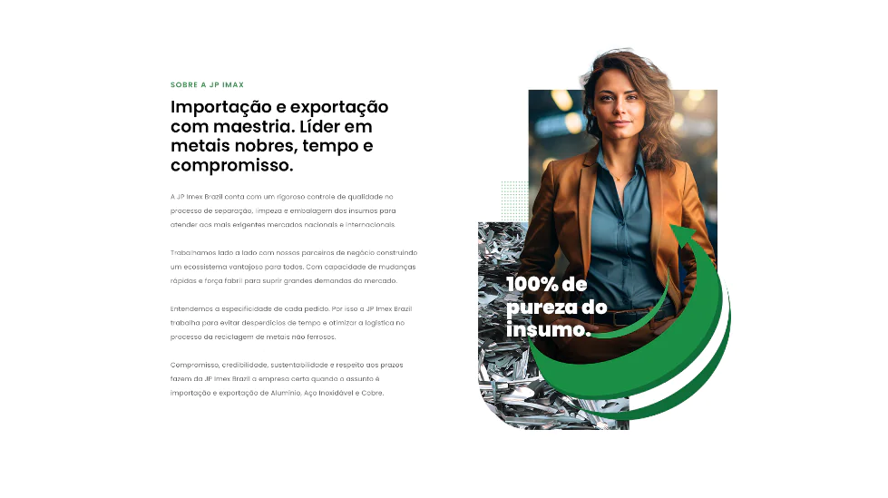 Nosso time está trabalhando no copy e no layout da interface que não apenas reflete a identidade e os valores da JP IMEX, mas oferece informações claras e detalhadas sobre seus processos e soluções inovadoras. Esse trabalho busca torná-los o único ponto de referência para os clientes e parceiros do segmento, demonstrando o compromisso contínuo da marca em liderar a transformação de resíduos em recursos valiosos.